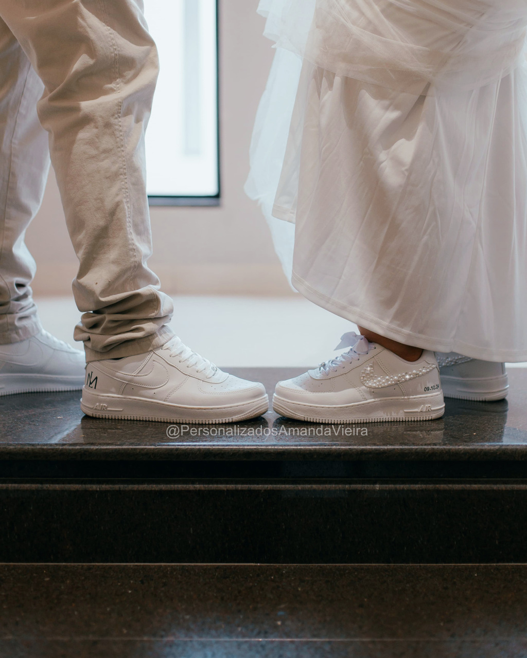 O KIT Tênis Casal Pérolas e Cristais é a escolha perfeita para noivos que desejam expressar seu estilo de forma única. Composto por dois pares de tênis, sendo um para a noiva personalizado com pérolas e cristais, e o outro para o noivo com escritas exclusivas, este kit é ideal para momentos especiais.